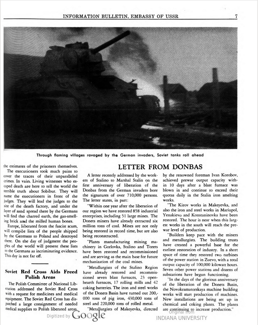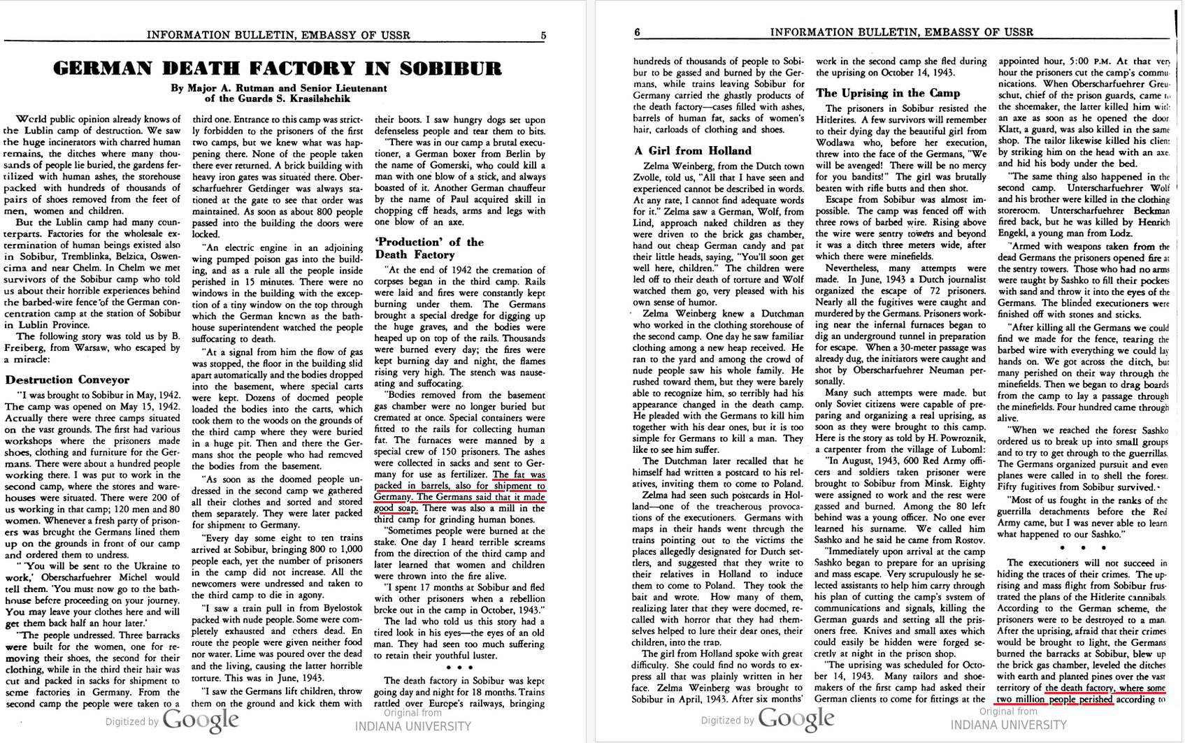 Seemingly unknown in literature on Sobibor, is the article which is produced in facsimile below. It appeared in the Information Bulletin, on September 15, 1944, which was a publication of the Soviet embassy in Washington D.C., similar to