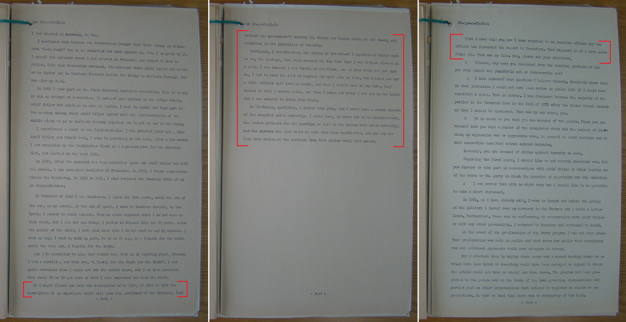 Julius Streicher testified over two days at Nuremberg, taking the stand in the the afternoon of Friday, April 26, 1946, and remaining there for all of the morning and into the afternoon session of Monday, April 29, 1946. The image above is three pages from the transcript of April 26, which was received in London on May 4, 1946. My annotations in red indicate the parts of Streicher's testimony which was stricken from the record, which is also quoted below (here Streicher was being questioned by his defence counsel Dr. Hanns Marx):