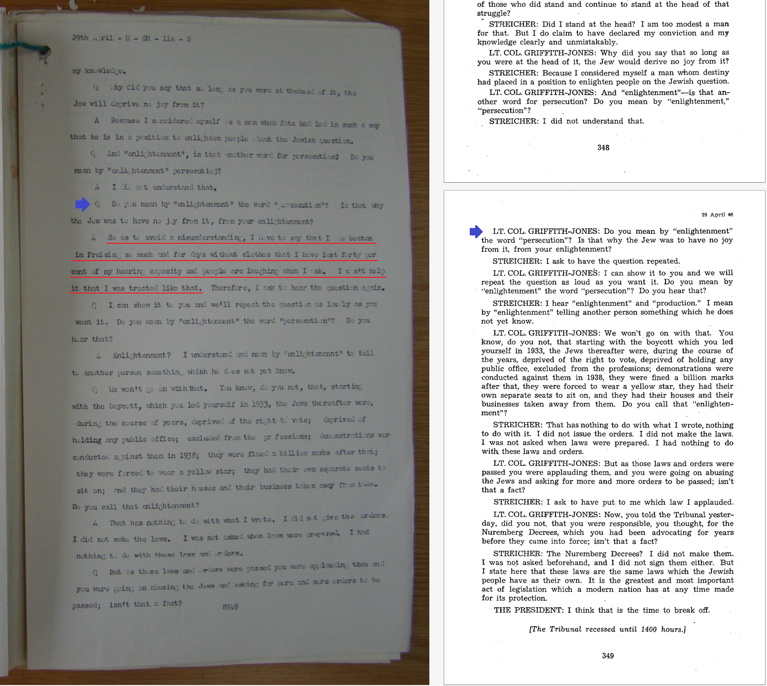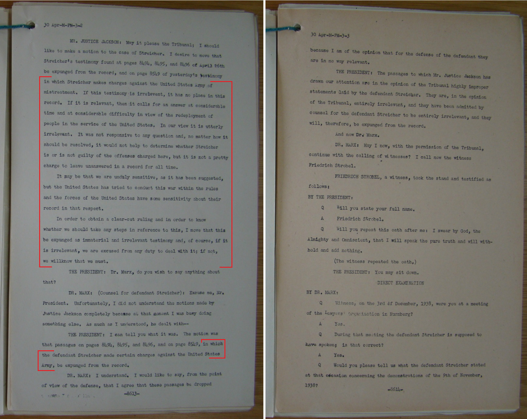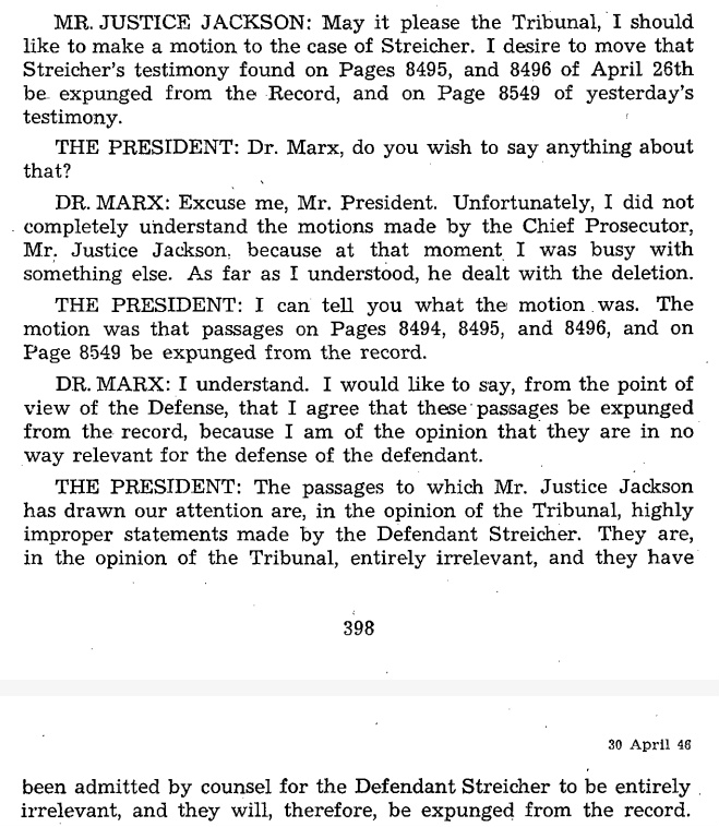 The image below is from the Blue Series volume 12, pp.398-399 (Avalon project version), and features an extract from the transcript of the Morning Session of Tuesday, April 30, 1946, whilst Lawrence (the British main judge and court President), Jackson (chief U.S. prosecutor) and Marx (Streicher's defence counsel) were discussing expunging parts of Streicher's testimony from the record: