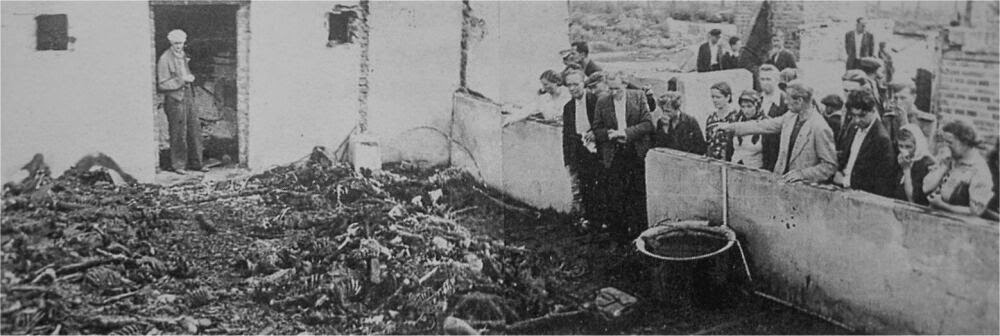 This is a composite image (source) of the ex-alleged homicidal gas chamber, which was created with two video-stills (laid side-by-side) taken from Soviet footage of the remnants of the crematorium following the fire which destroyed the parts built from wood (i.e. most of it). The cameraman who shot this film was standing in a similar position to where I took the photograph above.