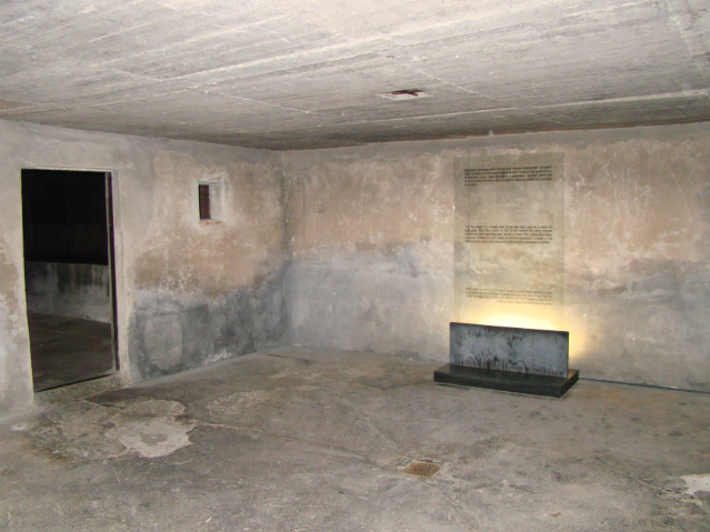 This photograph shows a long-removed museum sign in the former alleged homicidal gas chamber in the Soviet-reconstructed "new crematorium" at Majdanek. The script on the sign is not completely legible in the photograph, but the first line of the English text reads: "A gas chamber built to exterminate ...", and the Polish website from which I've taken the photograph confirms that the sign says prisoners were murder in this room with Zyklon B.