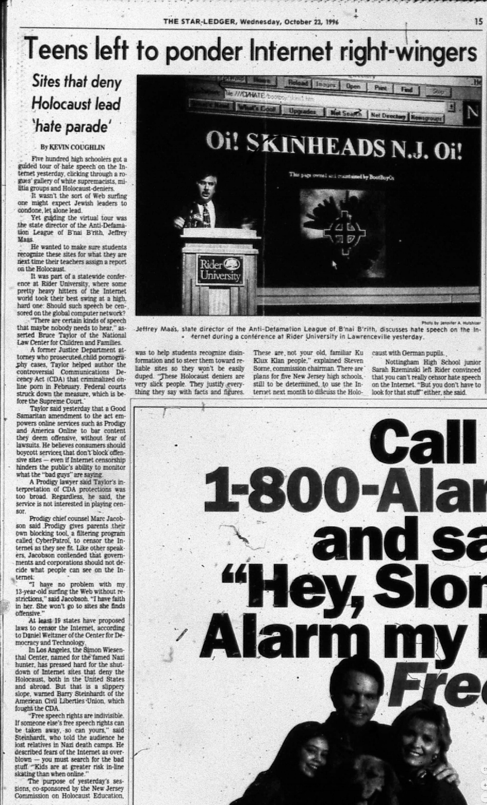 "Free speech rights are indivisible. If someone else's free speech rights can be taken away, so can yours," said Steinhardt, who told the audience he lost relatives in Nazi death camps. He described fears of the Internet as overblown — you must search for the bad stuff. "Kids are at greater risk in-line skating than when online."