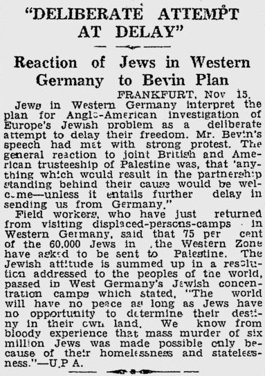 "The world will have no peace as long as Jews have no opportunity to determine their destiny in their own land. We know from bloody experience that mass murder of six million Jews was made possible only because of their homelessness and statelessness."