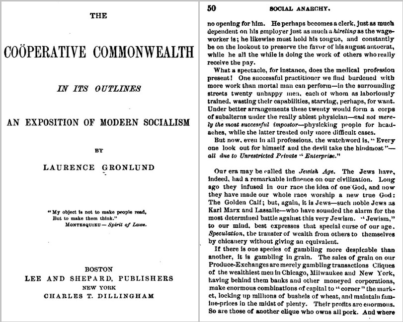 The extract below is taken from his 1884 book The Co-operative Commonwealth in its Outlines, An Exposition of Modern Socialism. Gronlund is clearly referring to Karl Marx's article On the Jewish Question here, in which Marx postulates that Jewish business practices, Jewish self-exclusion and antisemitism were all indelibly linked.