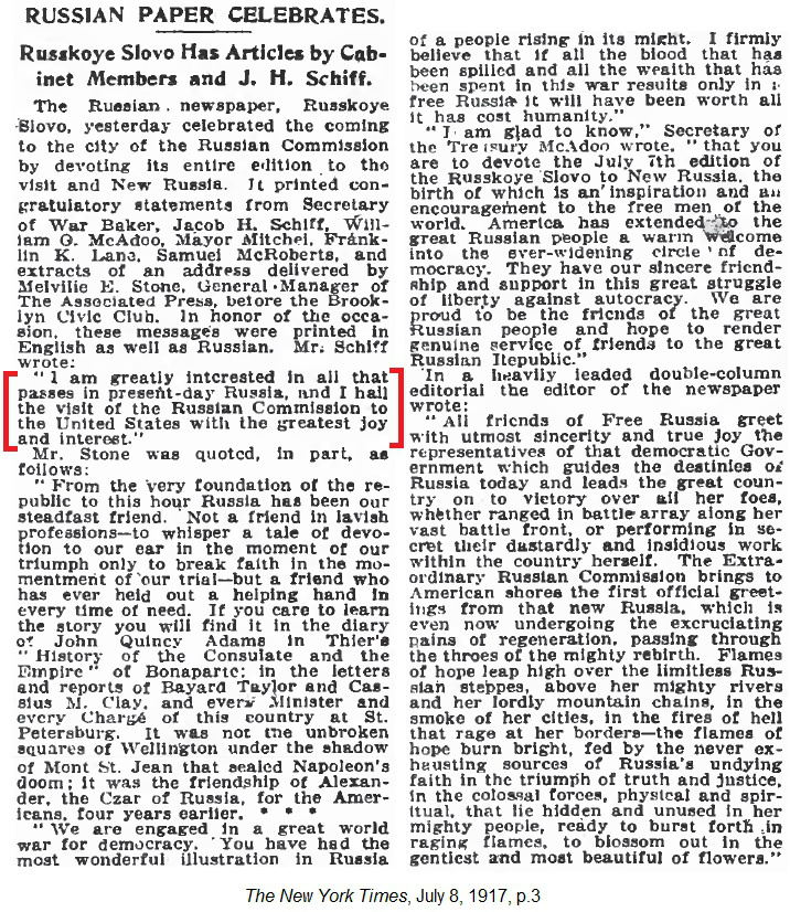 On July 7, 1917, the Russian newspaper Russkoye Slovo printed a message from Jewish mega-banker Jacob H. Schiff, regarding the new regime's envoys which had been sent to New York City:"I am greatly interested in all that passes in present-day Russia, and I hail the visit of the Russian Commission to the United States with the greatest joy and interest."
