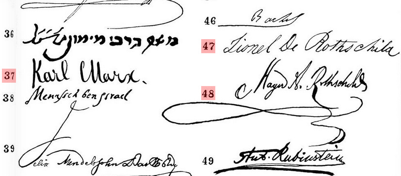 In Volume IV of The Jewish Encyclopaedia, published in 1902, there appears two pages of "autographs of Jewish celebrities." They are arranged in alphabetical order, and coincidentally, Karl Marx appears right next to Mayer Amschel Rothschild, and is just once-removed, from being next to Lionel de Rothschild, his second-cousins-once-removed.