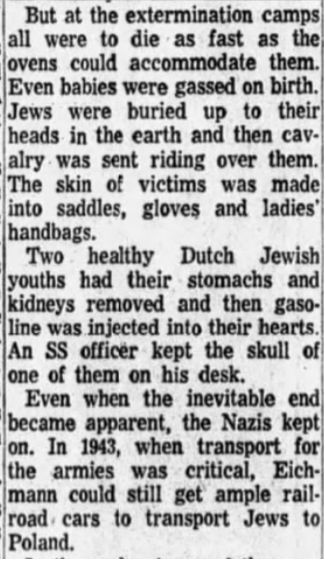 Even babies were gassed on birth. Jews were buried up to their heads in the earth and then cavalry was sent riding over them. The skin of victims was made into saddles, gloves and ladies' handbags.