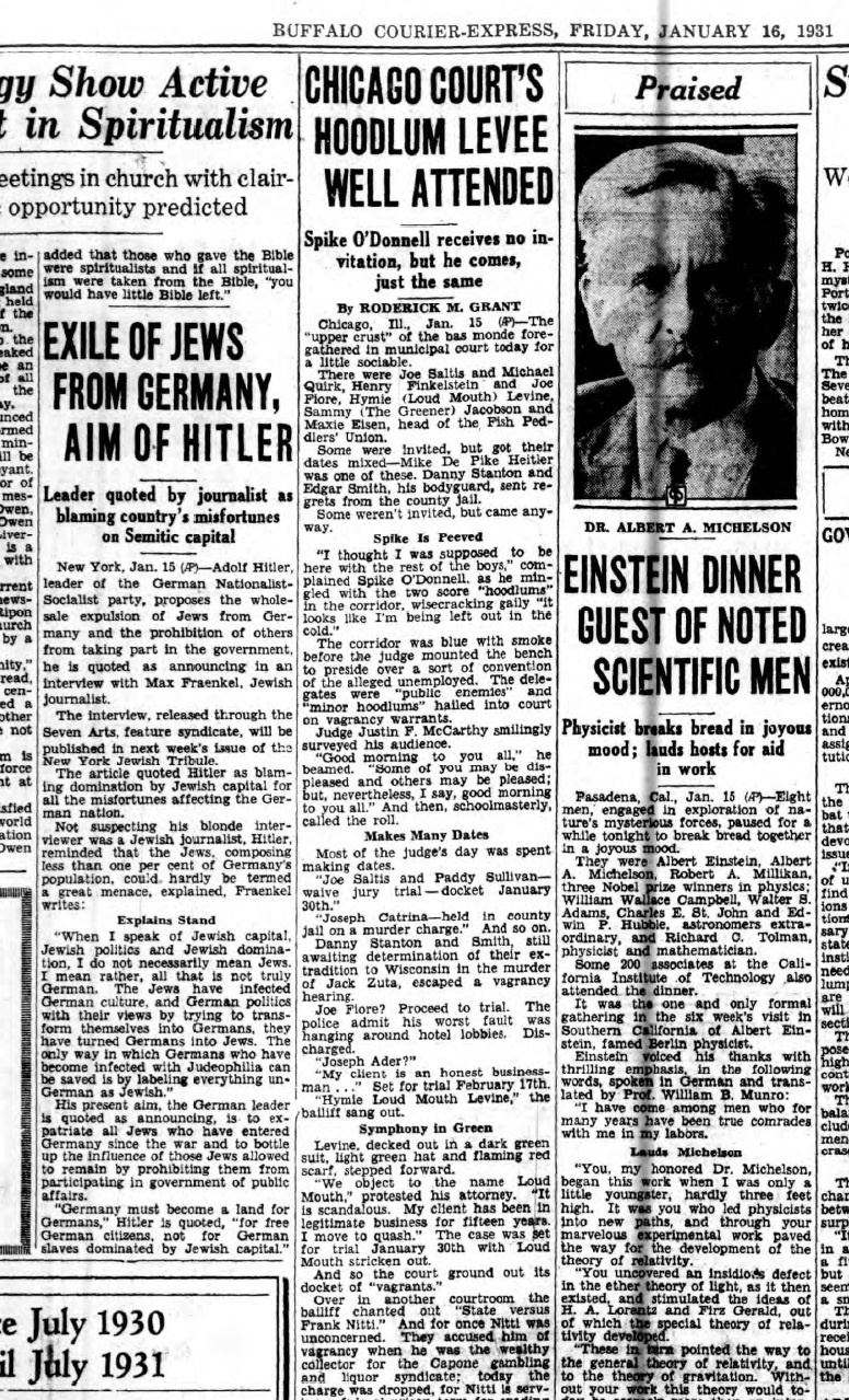 "I am a pacifist myself," was the surprising rejoinder of the man who seven years ago tried to capture the governmental reins of Bavarie [sic] by means of a military putsch. "By pacifism I" — he stressed the "I" in dramatic fashion — "understand the maintenance of peace as long as one's national honor is unsoiled. The Jewish view of peace, because of the international Jewish mind, means the surrender of all pride for the sake of financial interests."