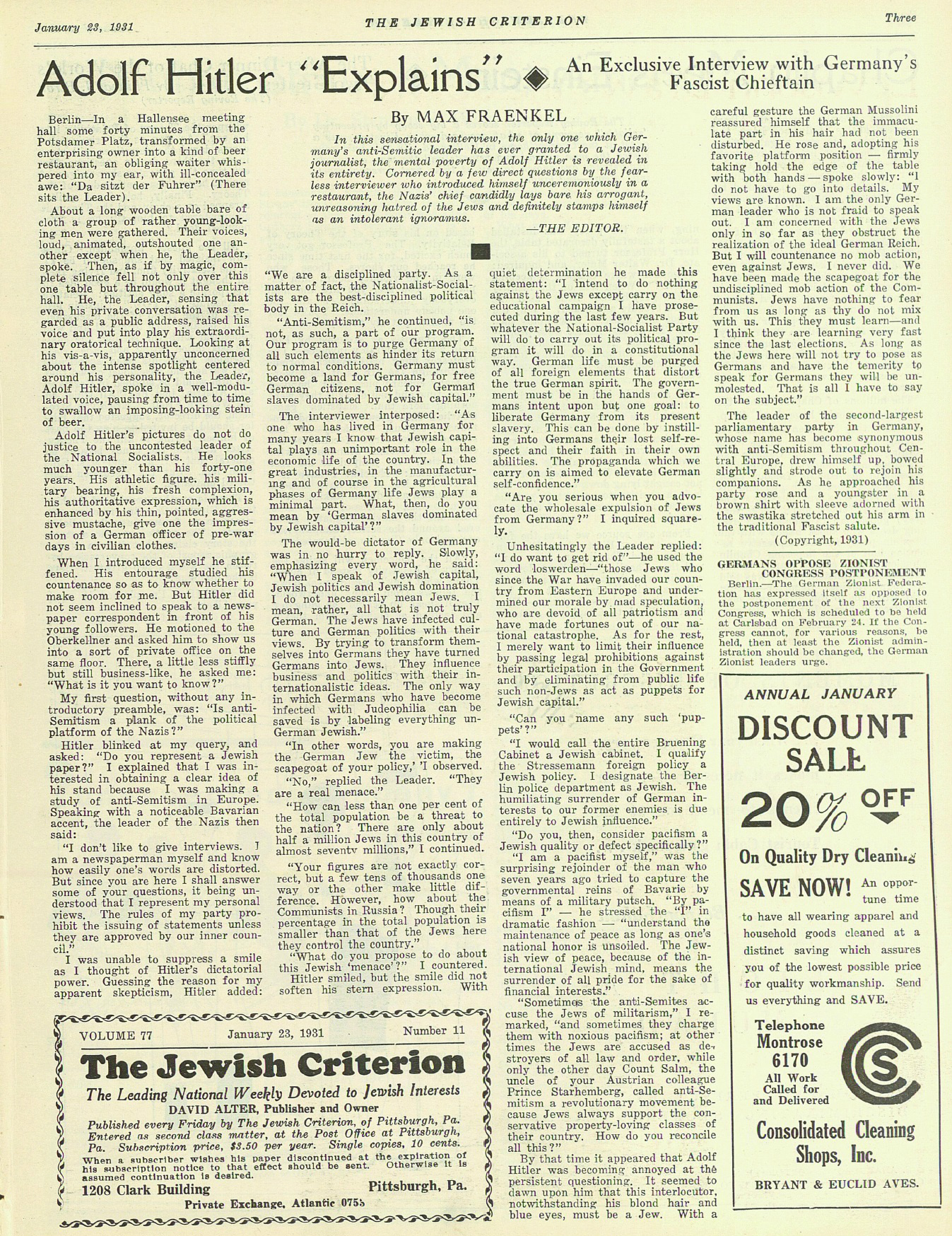 I guess the name of the interviewer: Max Fraenkel, could be a pseudonym, as the journalist didn't want any recriminations from Hitler or his followers following the publication of this interview in the U.S., and perhaps in Germany too. I can find nothing on the Internet about a journalist of this era named Max Fraenkel. The only other result I found for "Max Fraenkel" in the Criterion archives was this story from a fortnight later, which claims Hitler was upset at being duped, and had said that if a Jew wants to interview him, he'll have to pay him 5 marks per-word.