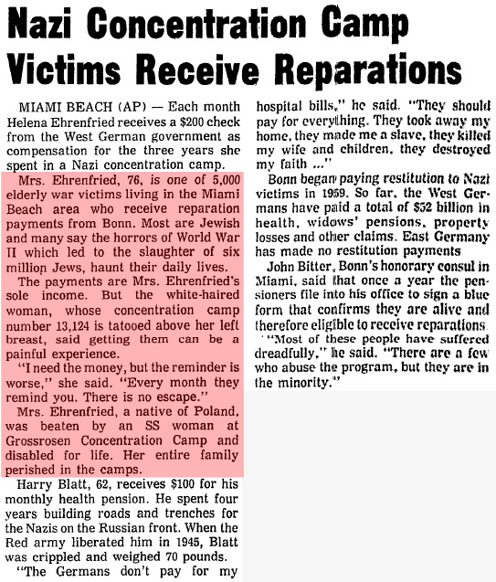 5,000 Holocaust survivors in Miami Beach area alone! Including Helena Ehrenfriend, aged 76, whose concentration camp number 13,124 is tattoo above her left breast!