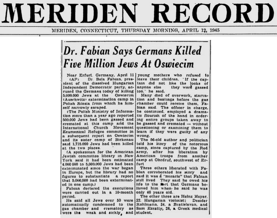 Hungarian Jew Dr. Bela Fabian told us in April 1945, that FIVE MILLION JEWS had been gassed at Auschwitz in just 10 months...