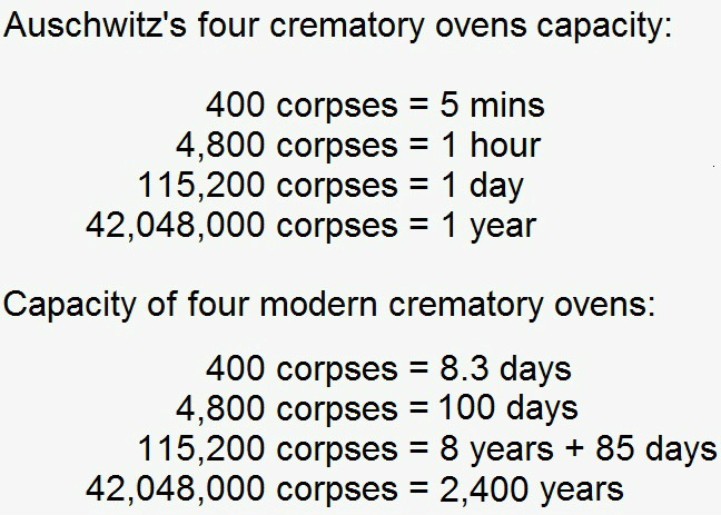 Auschwitz survivor Mr. Lieberman confirmed under oath in an affidavit submitted to the Nuremberg trials, that Auschwitz's "four ovens" could cremate four hundred corpses in just five minutes.