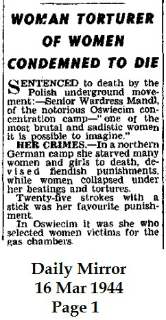 A month before Zionist Rudolf Vrba escaped from Auschwitz-Birkenau and 'informed' the world of the cyanide gas chambers there, the Daily Mirror reported on a German woman murdered by the Polish communists, for her role in selecting women to die in the Auschwitz gas chambers.