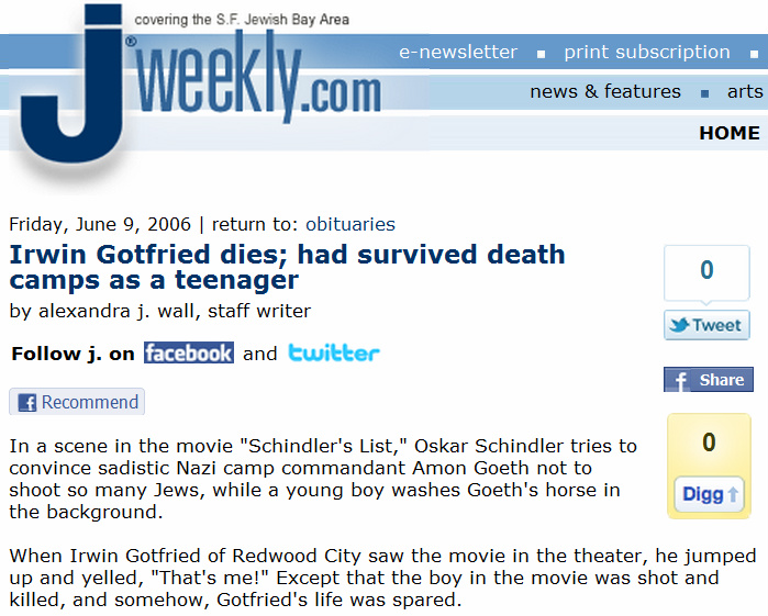 Apart from the funny story about Irwin Gotfried's stupid boast, he wasn't even in the concentration camp run by Amon Goeth. The journalist who wrote this piece, wasn't too familiar with the film, because that's not what happens. But I've made a tribute video to poor Irwin Gotfried, who kept his Holocaustic stories to himself until Schindler's List was released.