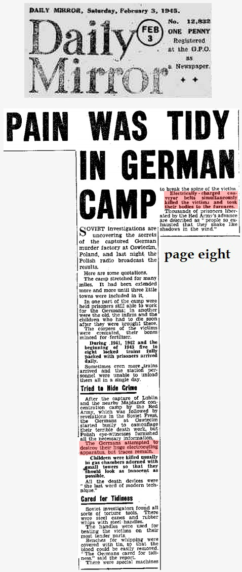 Only days after the Soviets captured Auschwitz, the first report on "factory of death" reported that the mass executions had been carried out by the Nazis were not by gassings, but with a huge conveyor belt, which electrocuted people, and then carried the bodies to a huge furnace for incineration.