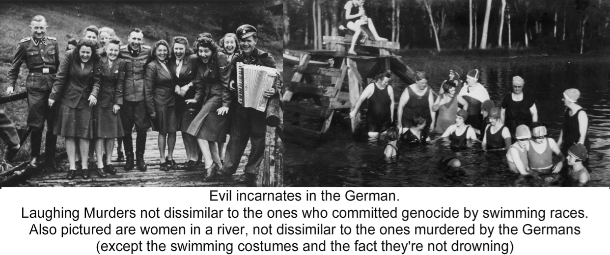 "...They [Germans] seized several dozen women, ordered them to undress, and declared to these unfortunates that those who managed to swim to the other shore would be allowed to live. Because of the stone dam, the river was very wide at this point. Most of the women drowned before reaching the opposite shore. Those who did manage to swim to the west shore were forced to swim back. The Germans amused themselves by watching the drowning women lose their strength and go to the bottom. The amusement continued until the last woman was drowned..."