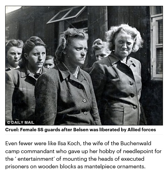 Ilse Koch, as well as using human shrunken heads as handles on her whips details used to beat the penises of Jews details