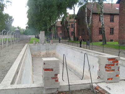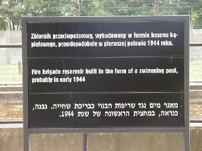 A sign in Polish, English & Hebrew by the swimming pool in Auschwitz I states: