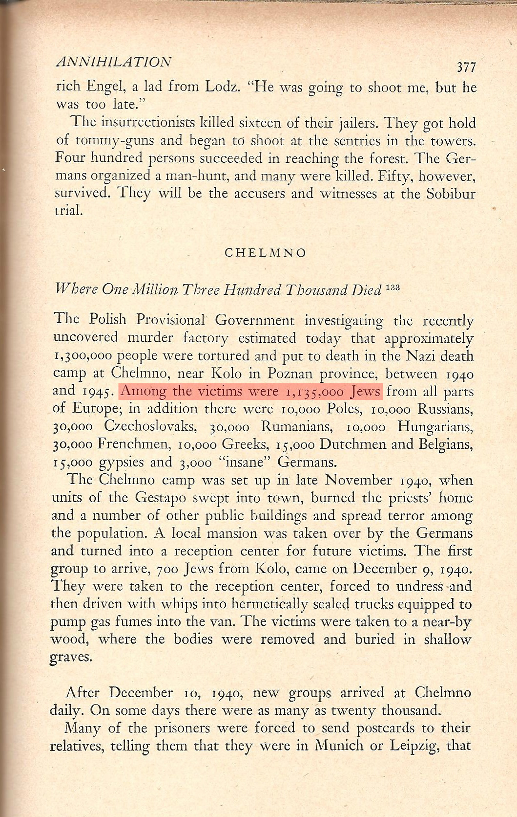 It claims 1,135,000 Jews were killed at Chelmno (since reduced to 150,000)