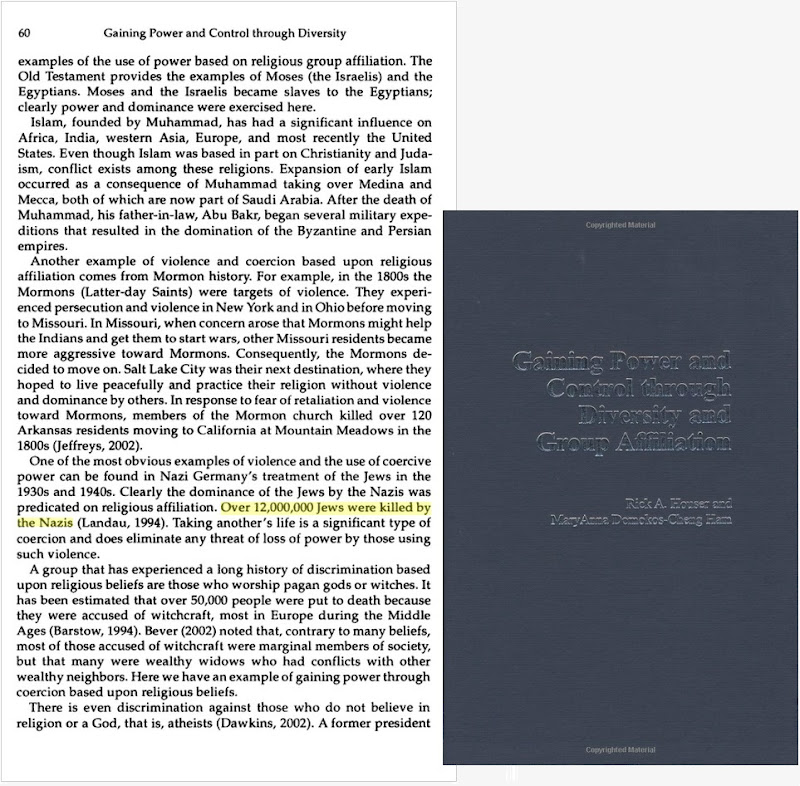 Claimed in their 2004—supposedly academic—book, that over 12,000,000 Jews were killed by the Nazis. It's clear from the context of the passage (it's about "violence and coercion based upon religious affiliation") that they didn't mean "over 12,000,000 people", they really meant "Jews". I've checked their
