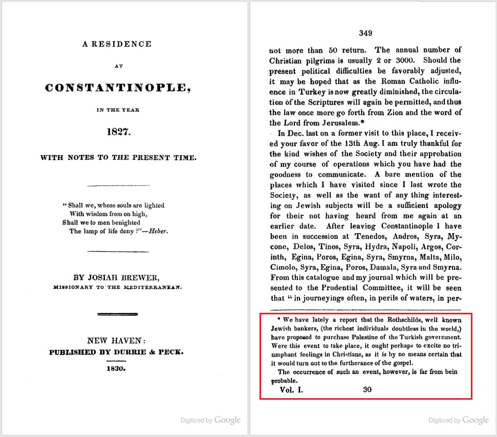 This book was published in Connecticut in 1830, by proselytizing Christians, it claims the Rothschild family had offered to purchase Palestine from the Ottoman Empire.