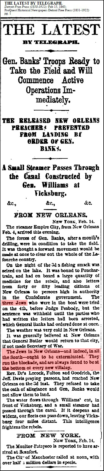 1863: Call to exterminate all Jews in the New Orleans & the South