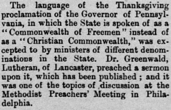 Below is a newspaper article from 1881 about how the phrase "Christian Commonwealth" was dropped for "Commonwealth of Freemen" in the Thanksgiving Day proclamation by the Governor of the State of Pennsylvania.