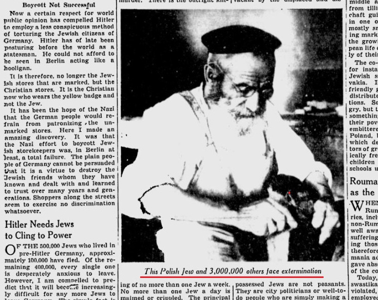 Detroit's Zionist-Rabbi Leon Fram, told readers of The Milwaukee Journal, on October 3, 1937, of "a program that has been deliberately planned and publicly announced by the men who head the Polish government." To exterminate the 3,000,000 Jews of Poland. And "[t]he principal weapon relied upon for carrying out the plan of extermination is starvation."