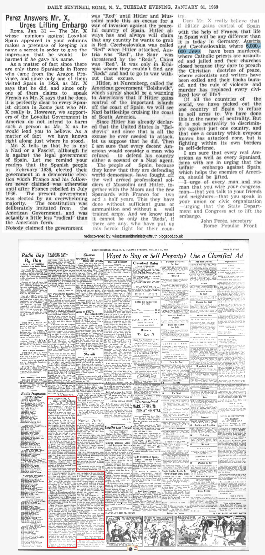 John Perez of the Rome Popular Front (i.e. Rome in Oneida County, New York State), was clearly a supporter of anti-Franco (i.e. communist) forces in Spain. He wrote to the Daily Sentinel of New York in January 1939—8 months before WWII began—advising that: