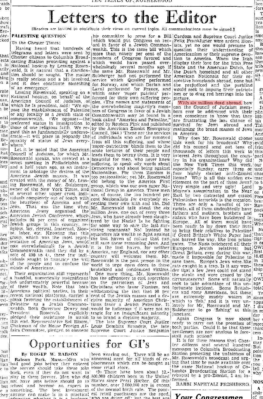 President of the Chester Zionist Organization, Rabbi Naphtali Frishberg wrote to the Chester Times in December 1944, claiming 6,000,000 Jews had been killed. Which is peculiar, as supposedly the world didn't find out that 6,000,000 was the figure until over a year after his letter was published.