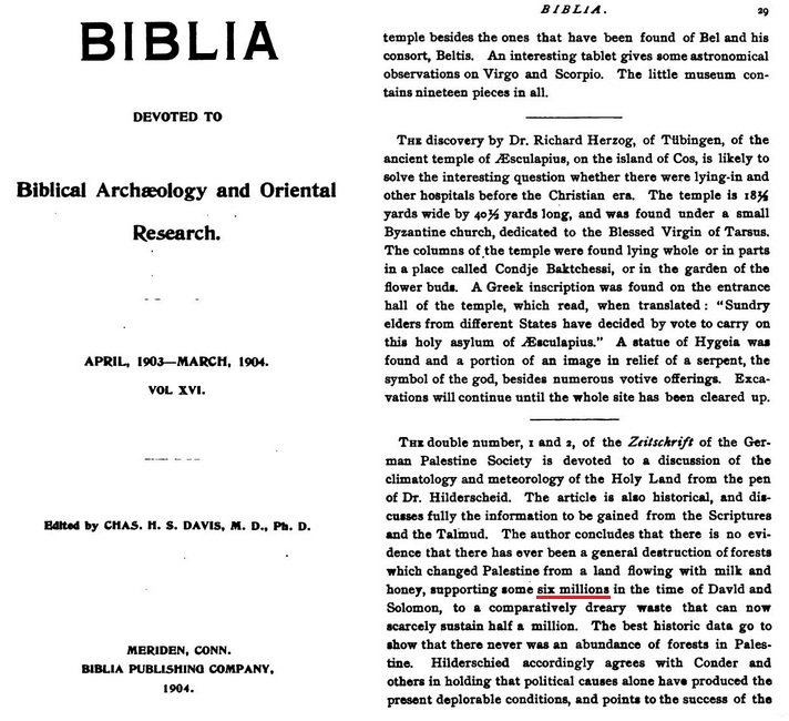 ... there is no evidence that there has ever been a general destruction of forests which changed Palestine from a land flowing with milk and honey, supporting some six millions in the time of David and Solomon, to a comparatively dreary waste that can now scarcely sustain half a million. The best historic data go to show that there never was an abundance of forests in Palestine.