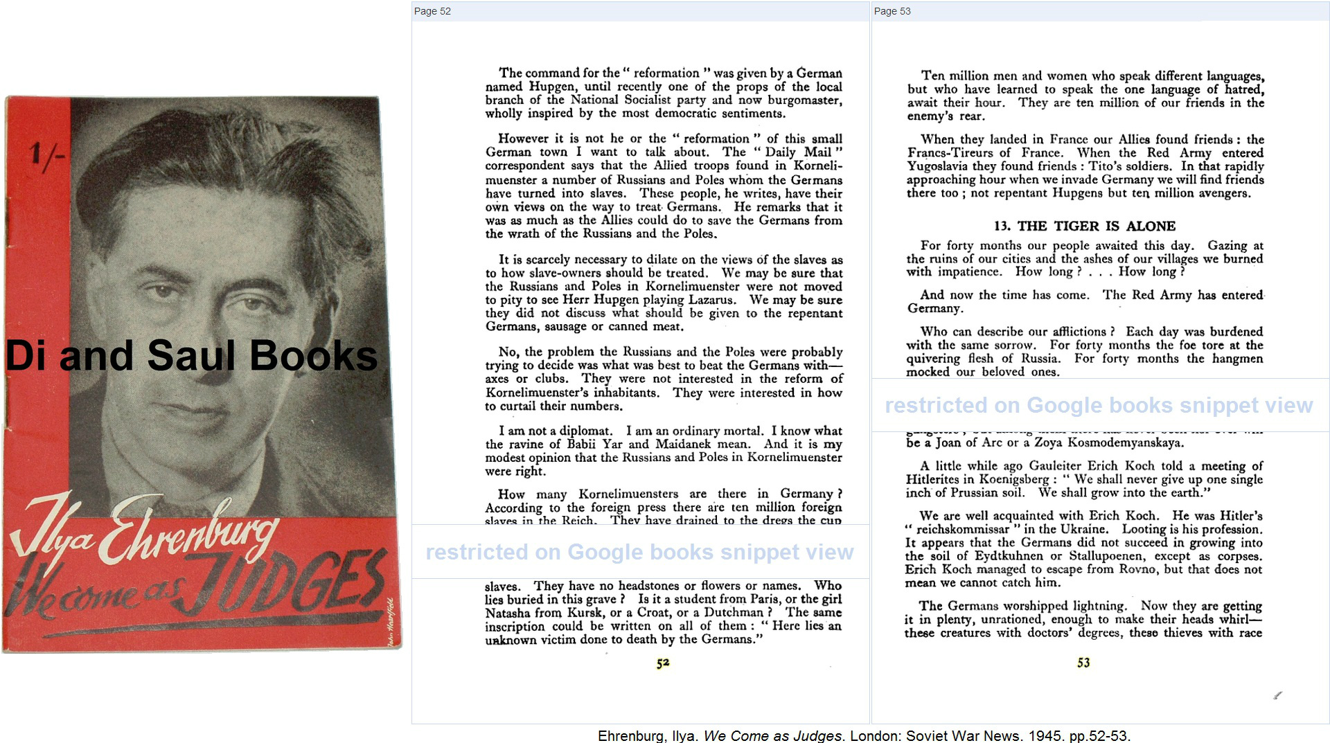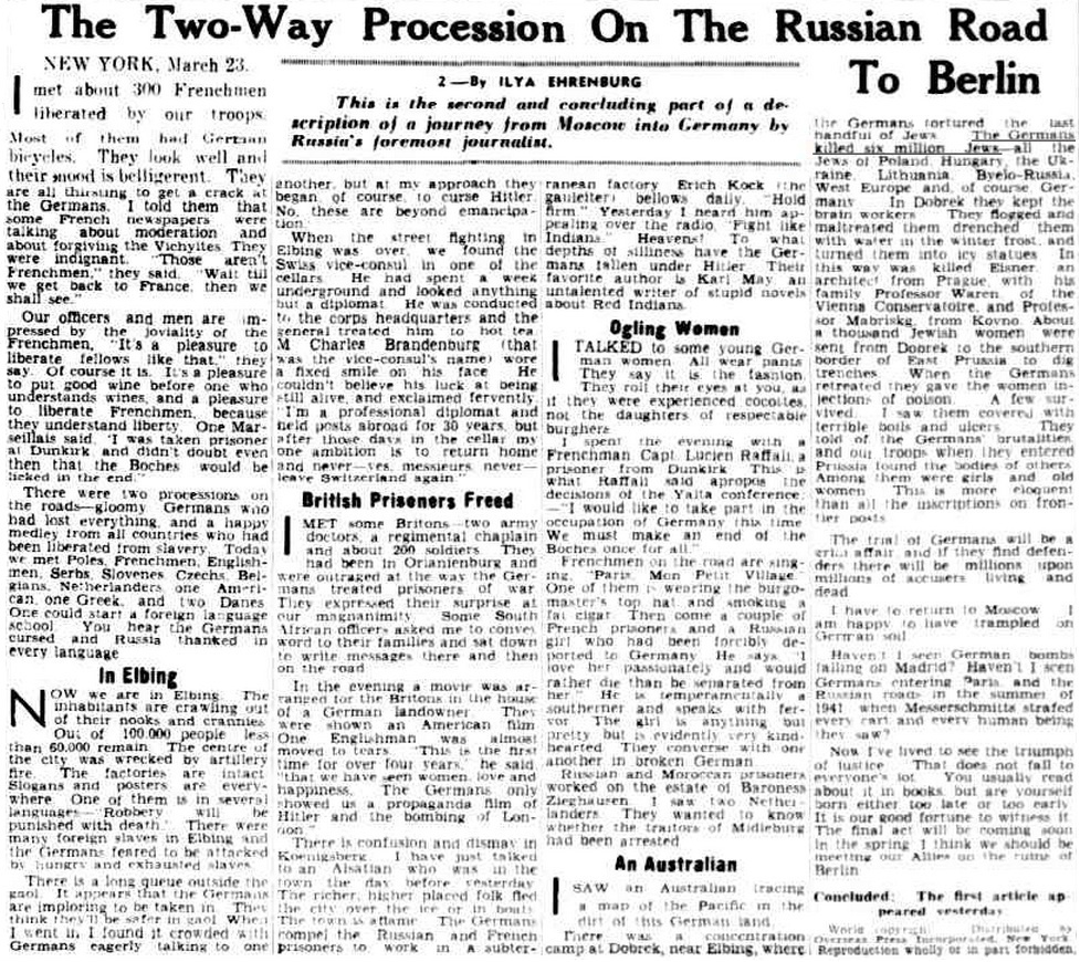 The following five articles were not written by Ehrenburg, but he is mentioned in them by name, and are about distribution of volume one of his Black Book, which was written in Yiddish. The English edition of The Black Book was published in New York in March 1946.