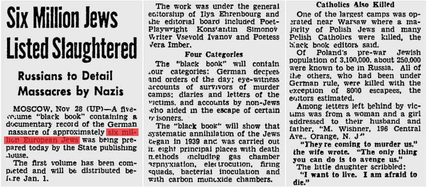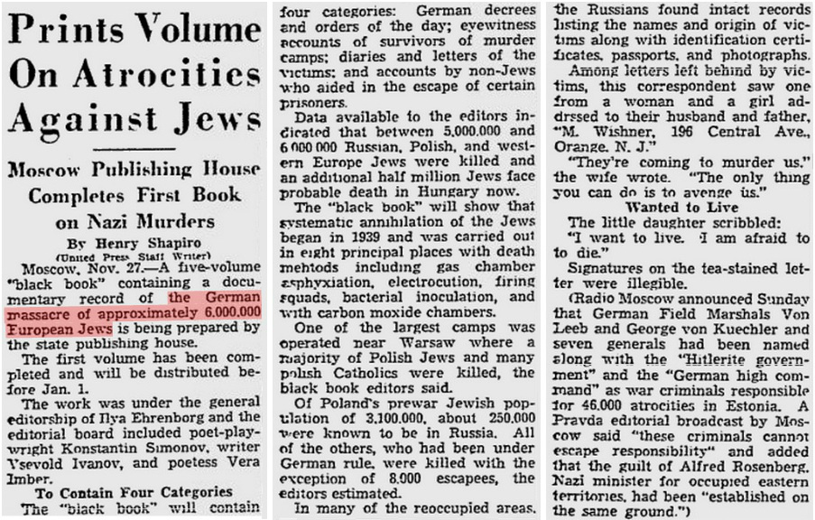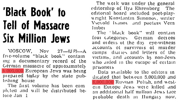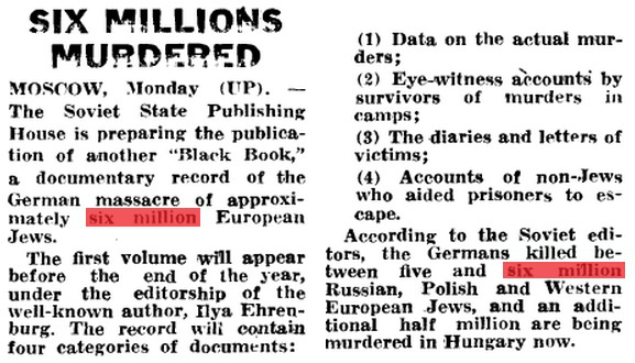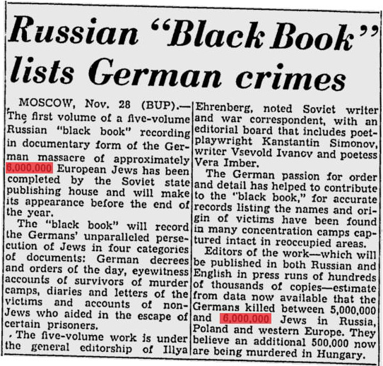 MOSCOW, Monday (UP). —The Soviet State Publishing House is preparing the publication of another "Black Book," a documentary record of the German massacre of approximately six million European Jews. The first volume will appear before the end of the year, under the editorship of the well-known author, Ilya Ehrenburg. [...] According to the Soviet editors, the Germans killed between five and six million Russian, Polish and Western European Jews, and an additional half million are being murdered in Hungary now."