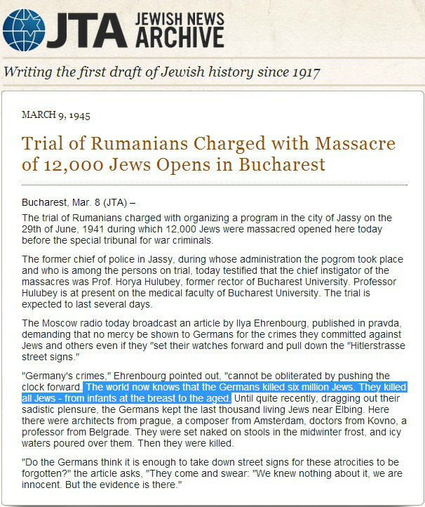 As I've mentioned many times before, Jews and Zionists were repeatedly claiming that the Kabbalisticly significant figure of '6,000,000', was the number of Jews killed, long before they supposedly found out that 6,000,000 Jews had been killed. I've listed 20+ of them. In this article, I've just compiled the too early claims by Ilya Ehrenburg that 6,000,000 Jews had been killed, although I doubt this list is comprehensive, there's surely more claims he made that I'm presently unaware of.