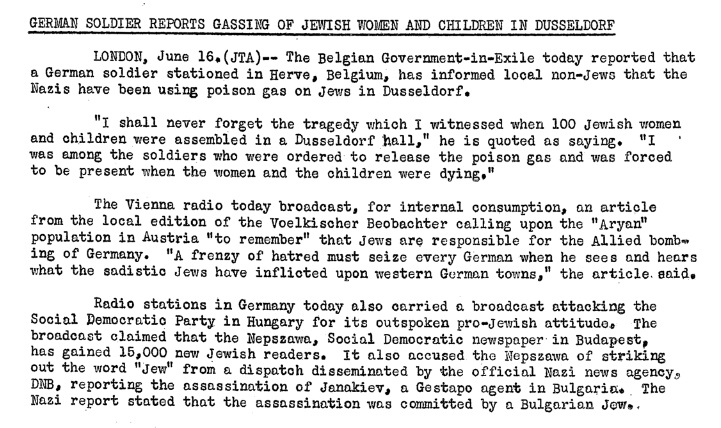 The Vienna radio today broadcast, for internal consumption, an article from the local edition of the Voelkischer Beobachter calling upon the “Aryan” population in Austria “to remember” that Jews are responsible for the Allied bombing of Germany. “A frenzy of hatred must seize every German when he sees and hears what the sadistic Jews have inflicted upon western German towns,” the article said.