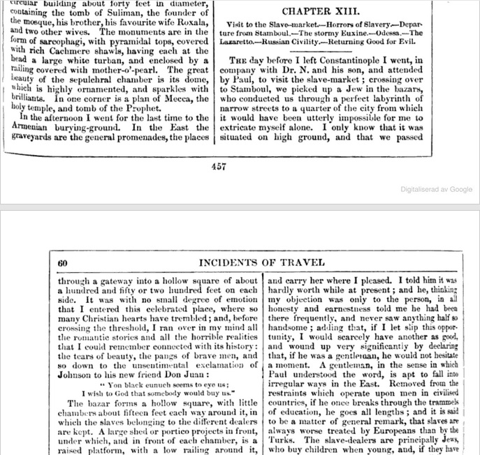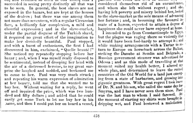 The day before I left Constantinople I went, in the company with Dr. N. and his son, and attended by Paul, to visit the slave-market; crossing over to Stamboul, we picked up a Jew in the bazars, who conducted us through a perfect labyrinth of narrow streets to a quarter of the city from which it would have been utterly impossible for me to extricate myself alone. ...