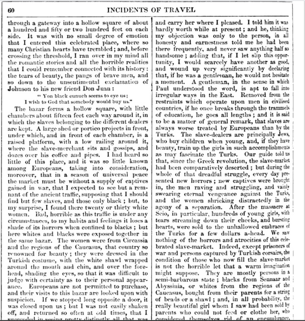 John Lloyd Stephens (1805 - 1852) was an American writer, explorer and diplomat. In 1835 he travelled in the Middle-East and witnessed the slave market of Constantinople, now Istanbul, Turkey.