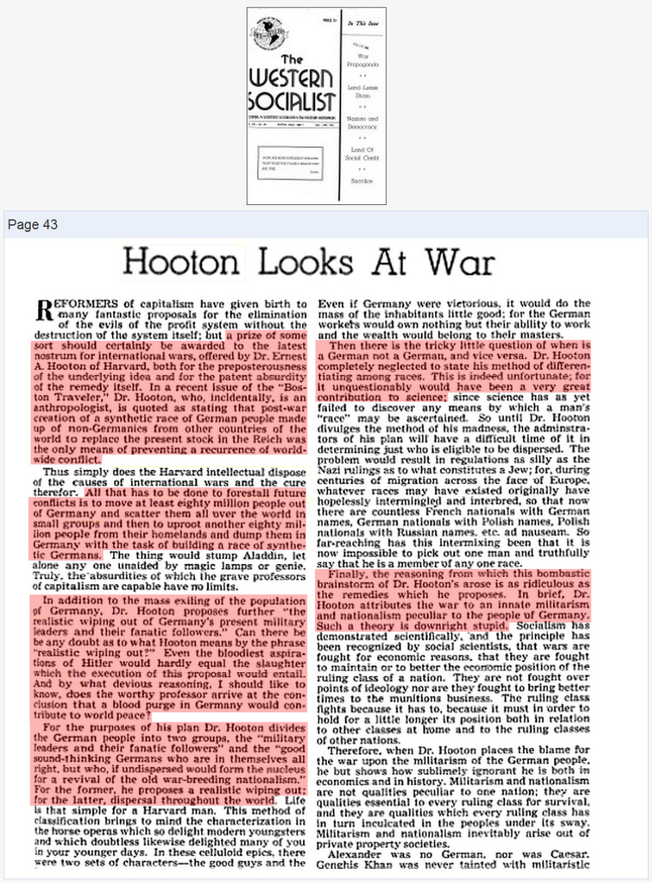 "... a prize of some sort should certainly be awarded to the latest nostrum for international wars, offered by Dr. Ernest A. Hooton of Harvard, both for preposterousness of the underlying idea and for the patent absurdity of the remedy itself. In a recent issue of the "Boston Traveller," Dr.Hooton, who, incidentally, is an anthropologist, is quoted as stating that post-war creation ofa synthetic race of German people made up of non-Germanics from other countries of the world to replace the present stock in the Reich was the only means of preventing a recurrence of world-wide conflict.