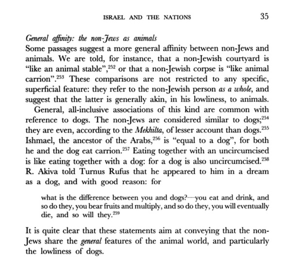 It is quite clear that these statements aim at conveying that the non-Jews share the general features of the animal world, and particularly the lowliness of dogs.»