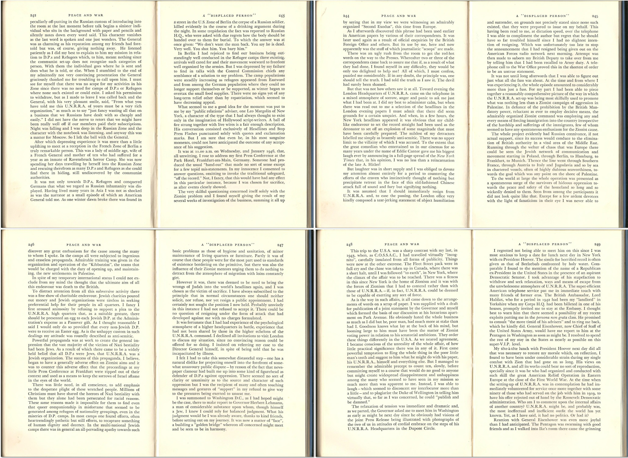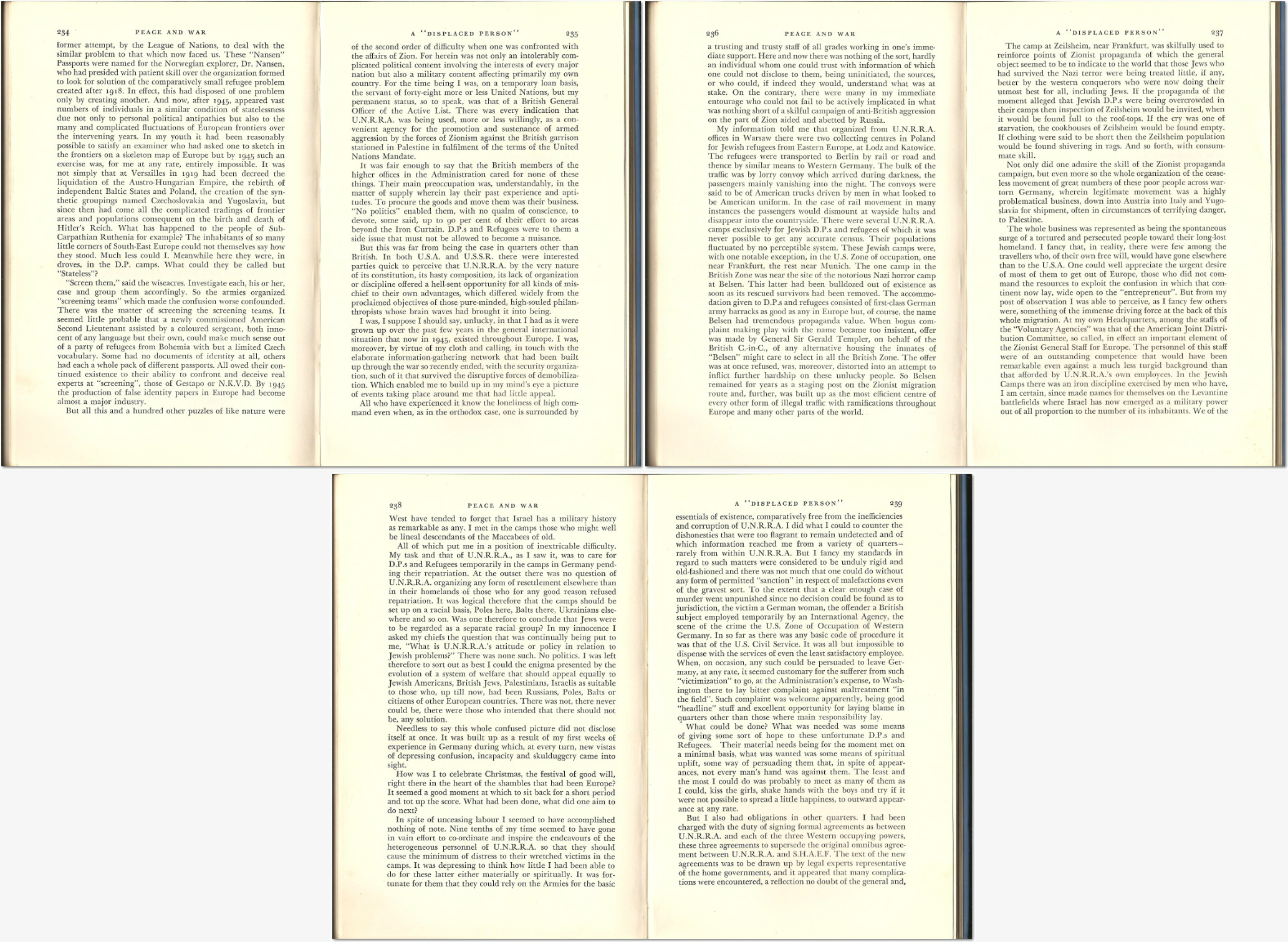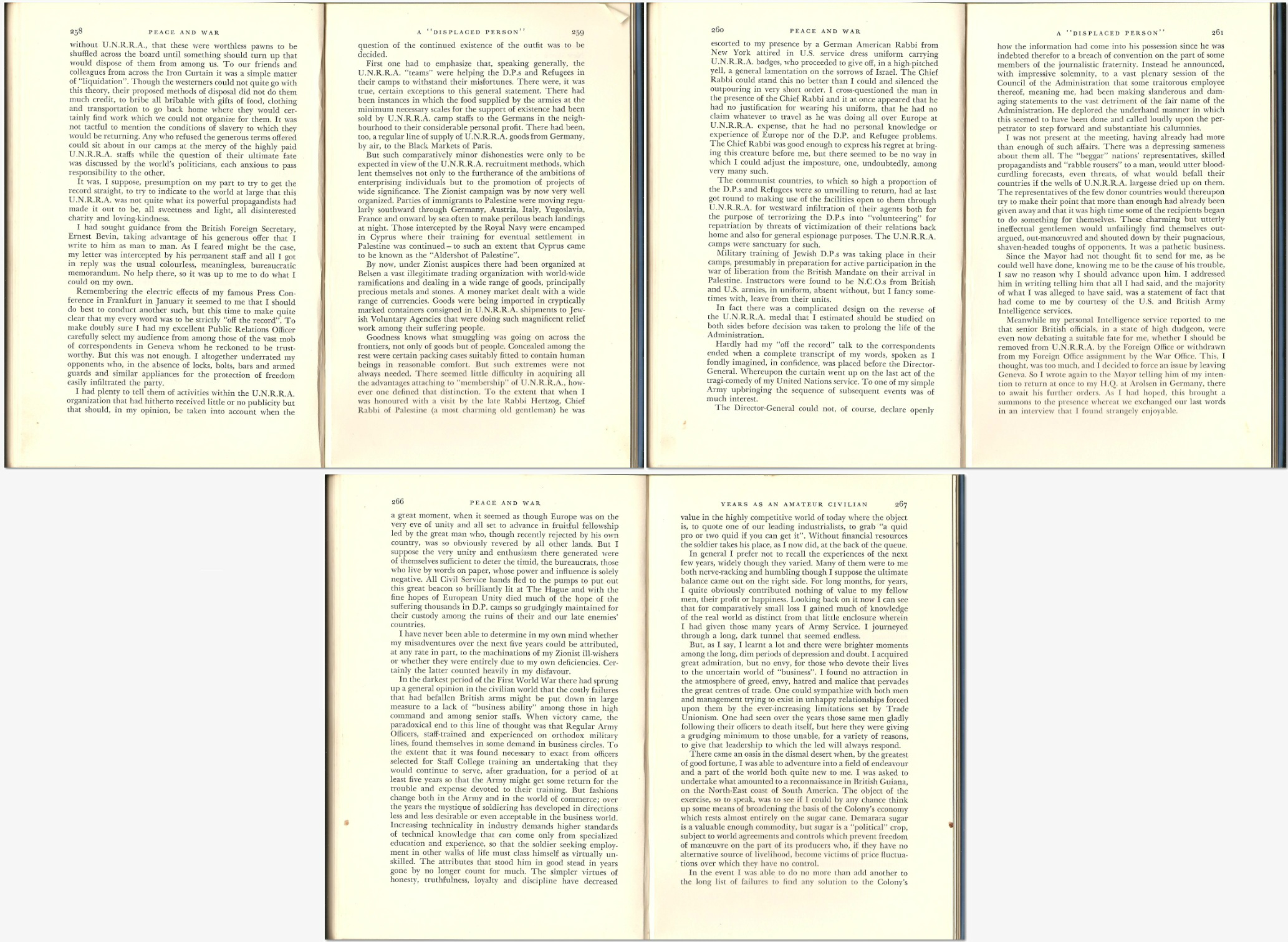 All of which put me in a position of inextricable difficulty. My task and that of U.N.R.R.A., as I saw it, was to care for D.P.s and Refugees temporarily in the camps in Germany pending repatriation. At the outset there was no question of the U.N.R.R.A. organizing any form of resettlement elsewhere than their homelands of those who for any good reason refused repatriation. It was logical therefore that the camps should be set up on a racial basis, Poles here, Balts there, Ukrainians elsewhere and so on. Was one therefore to conclude that Jews were to be regarded as a separate racial group? In my innocence I asked my chiefs the question that was continually being put to me, "What is U.N.R.R.A.'s attitude or policy in relation to Jewish problems?" There was none such. No politics. I was left therefore to sort out as best I could the enigma presented by the evolution of a system of welfare that should appeal equally to Jewish Americans, British Jews, Palestinians, Israelis as suitable to those who, up till now, had been Russians, Poles, Balts or citizens of other European countries. There was not, there never could be, there were those intended that there should not be, any solution.