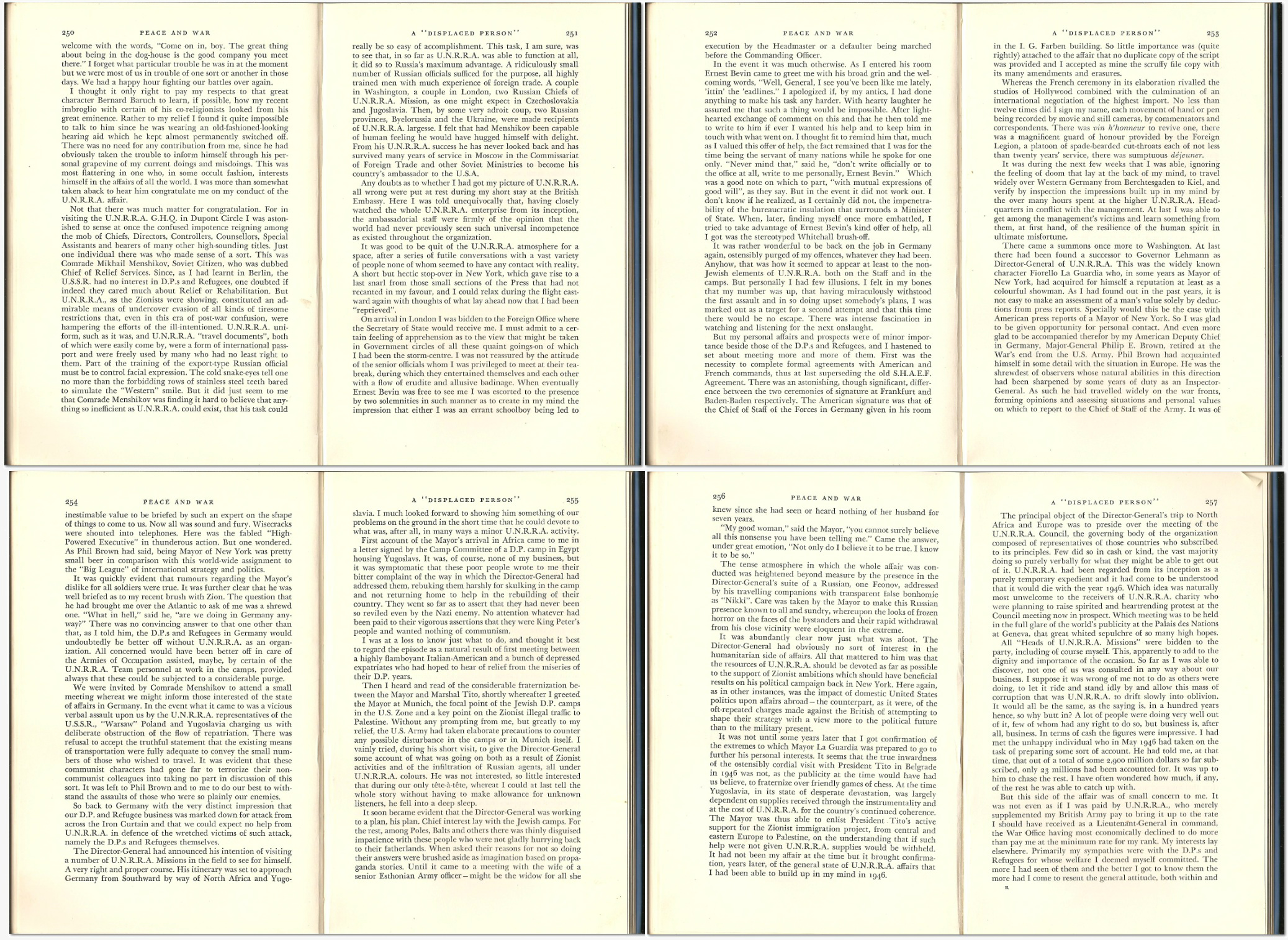 But this was far from being the case in the quarters other than the British. In both the U.S.A. and U.S.S.R. there were interested parties quick to perceive that U.N.R.R.A. by the very nature of its constitution, its hasty composition, its lack of organization or discipline offered a hell-sent opportunity for all kinds of mischief to their own advantages, which differed widely from the proclaimed objectives of those pure-minded, high-souled philanthropists whose brain waves had brought it into being.