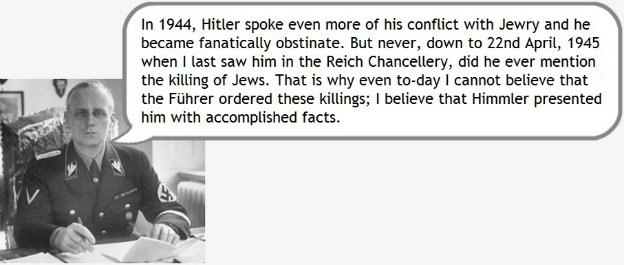 In 1944, Hitler spoke even more of his conflict with Jewry and he became fanatically obstinate. But never, down to 22nd April, 1945 when I last saw him in the Reich Chancellery, did he ever mention the killing of Jews. That is why even to-day I cannot believe that the Führer ordered these killings; I believe that Himmler presented him with accomplished facts.