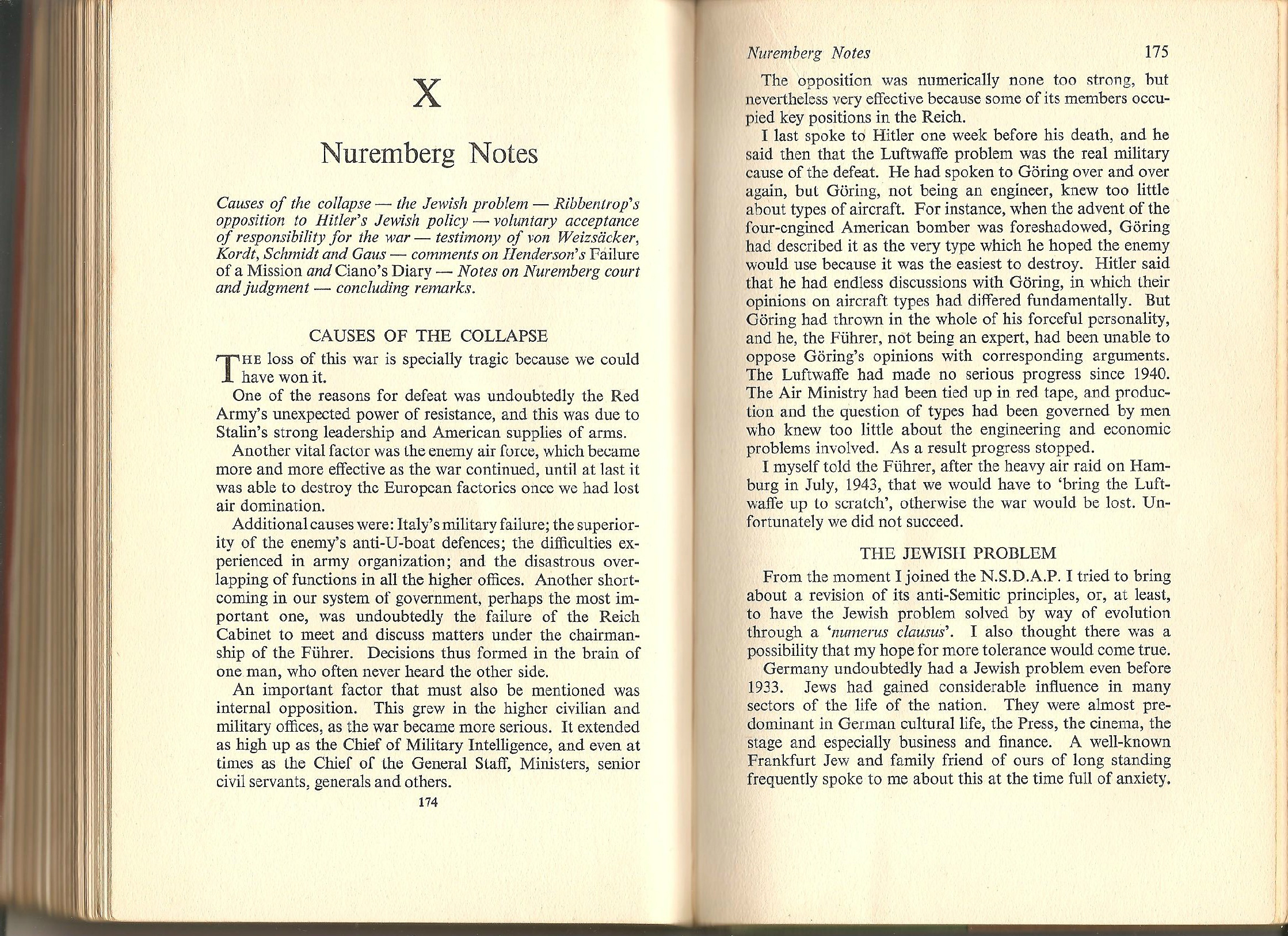 After the outbreak of hostilities the propaganda war between National Socialist Germany and international Jewry became increasingly bitter; this made Hitler even more inflexible and it became more and more difficult to talk to him about the Jewish question. In spite of this I indicated to him the great disadvantages from the point of view of foreign policy of the anti-Jewish policy on several occasions. American propaganda, and even that of some netural governments, made great play with the Jewish question and made things very difficult for us. Most of this propaganda originated in the Anglo-American world. I always told Hitler that the enmity of world Jewry appeared unnecessary, and that it was tantamount to having an additional great power as an enemy.