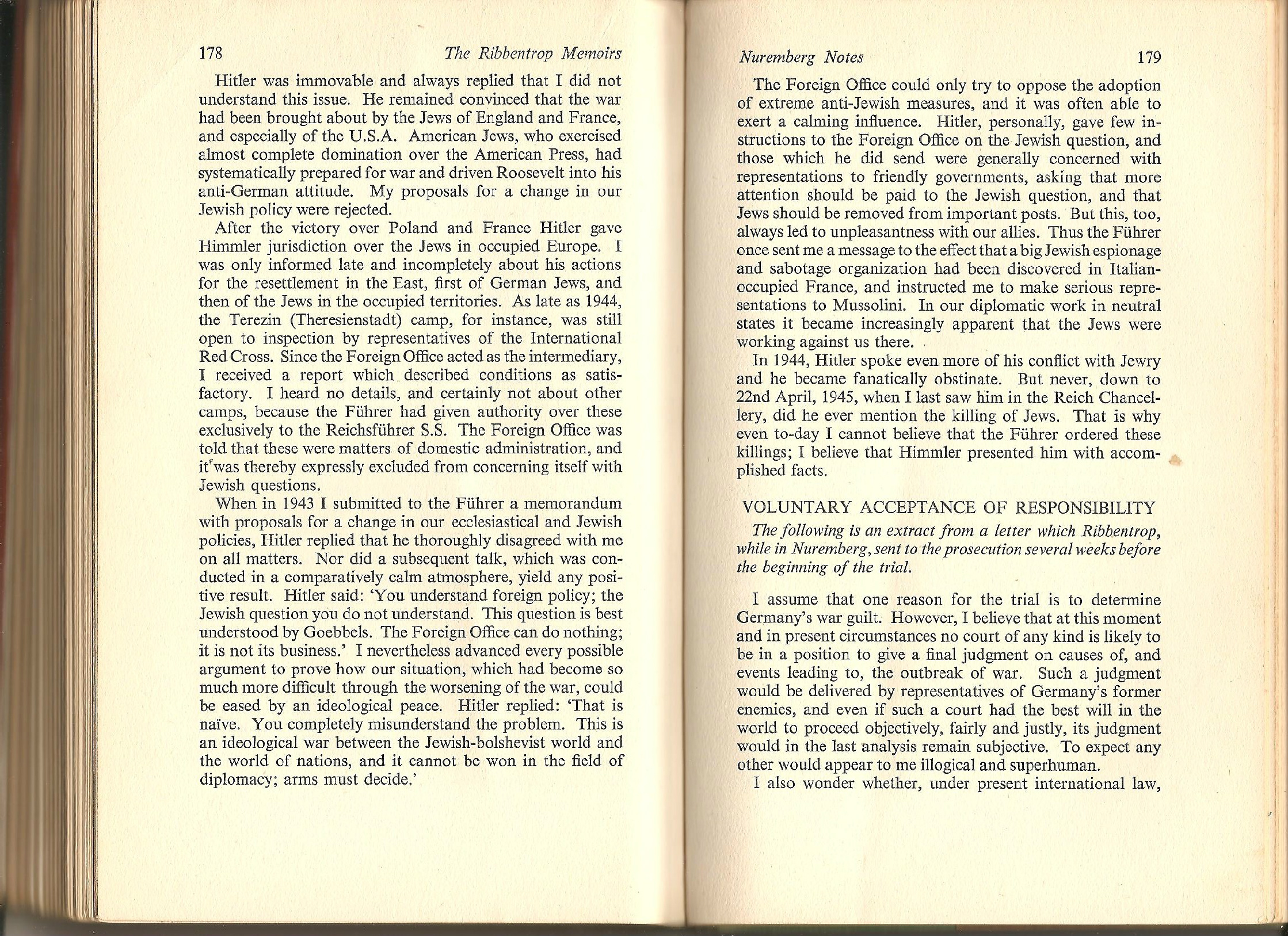 But Goering wasn't the only senior member of the NSDAP who was of the opinion that Hitler did not order the mass killing of Jews. I've recently obtained a copy of the memoirs of Joachim von Ribbentrop, the German Foreign Minister. He too was