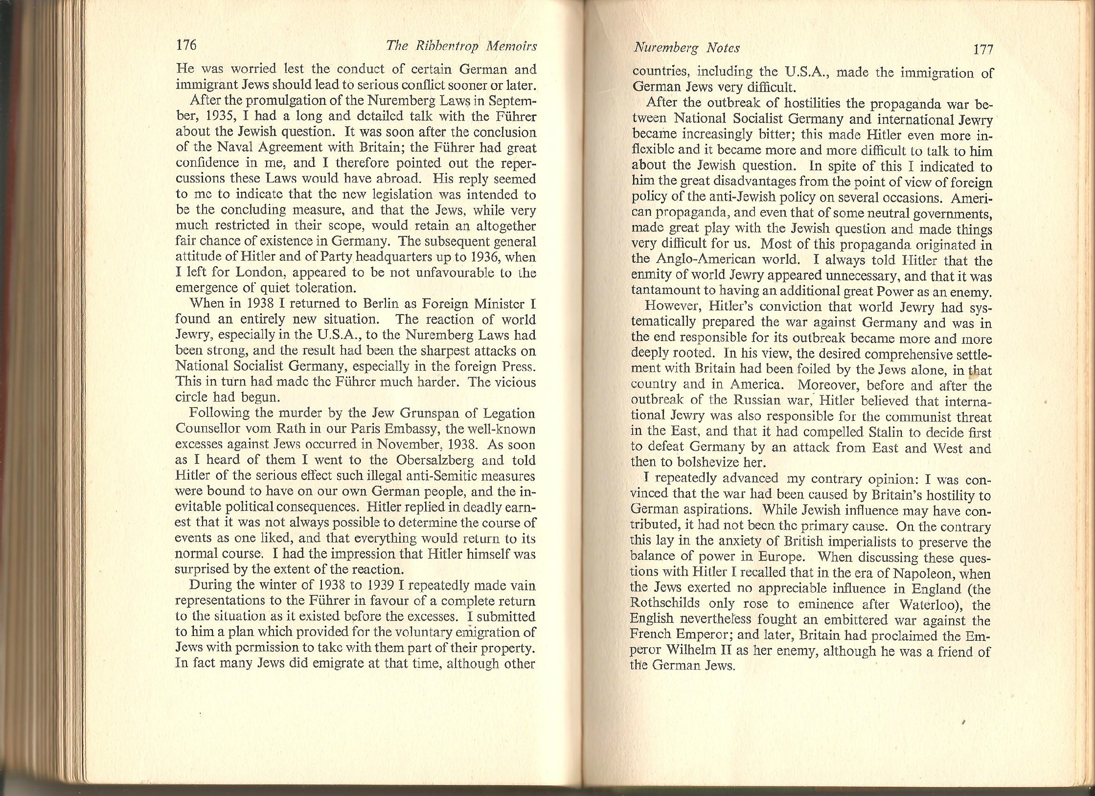 When in 1938 I returned to Berlin as Foreign Minister I found an entirely new situation. The reaction of world Jewry, especially in the U.S.A., to the Nuremberg Laws had been strong, and the result had been the sharpest attacks on National Socialist Germany, especially in the foreign Press. This in turn had made the Führer much harder. The vicious circle had begun.
