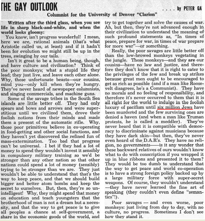 In 1945, a 22 year old Peter Gay was a student at the University of Denver and a columnist for its student newspaper the Clarion. His column was entitled "The Gay Outlook", and the one below was actually published in the Gateway, a University of Alberta students' newspaper. I don't know when the article was originally published in the Clarion, but it was republished in the Gateway on November 9, 1945.