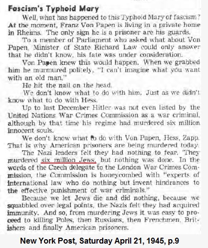 Nine days before Hilter's suicide, 16 days before Germany surrendered, the New York Post knew that six million Jews had been murdered.
