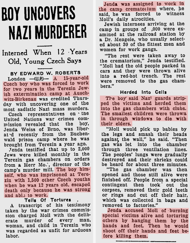 The following is a widely reported story about a 15 year old boy who gave an affidavit to Czech war crimes investigators at Buchenwald in 1945 in which he supposedly claimed to have had finished working as a sonderkommado at Auschwitz-Birkenau the previous year, i.e. at aged 14, when he was transferred to Buchenwald. What age he claimed to have started working as a sonderkommando is unclear, but maybe it was at aged 12, as the article does suggest.
