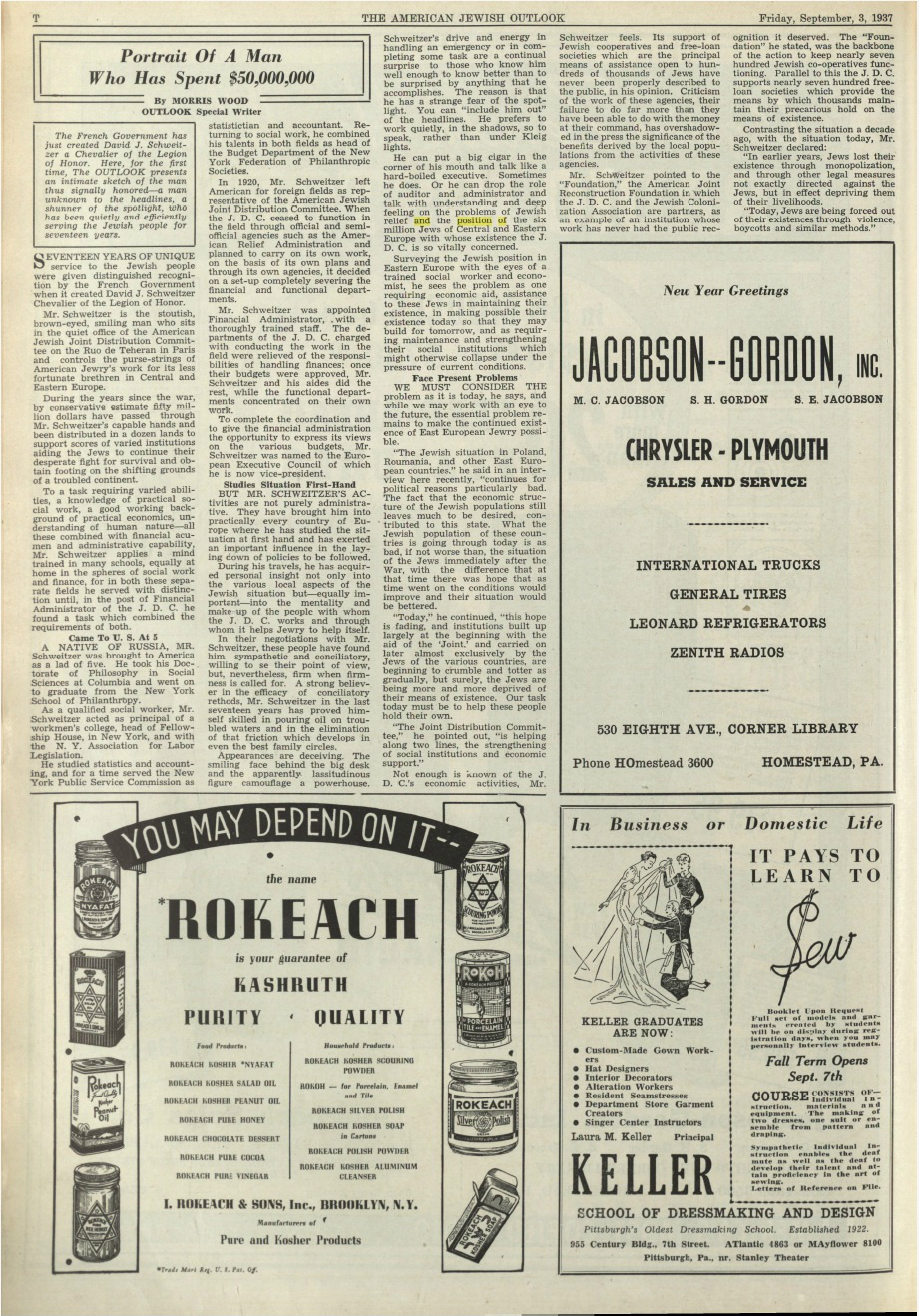 In 1937, Russian born American Jew David J. Schweitzer, vice-president of the European Executive Council of the Jewish Joint Distribution Committee, had deep feeling and understanding about "the position of the six million Jews of Central and Eastern Europe with whose existence the J.D.C." was "so vitally concerned."
