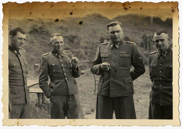 (L. to R.) Josef Mengele, Rudolf Hoess, Josef Kramer, and Anton Thumann